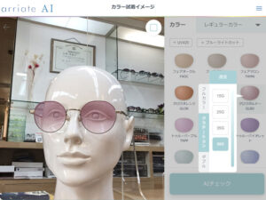 髪色・肌色・フレームカラーと、選択したレンズカラーから「AI」がお客様へお似合い度を判定する「AIチェック」があります。こちらはお遊び感覚で楽しんでみてください。