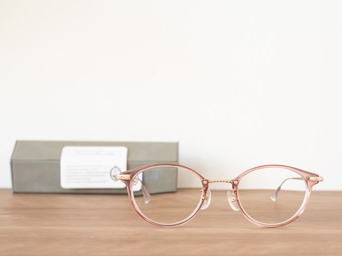 落ち着いたクリア系のピンクカラーの生地と、上品なゴールドカラーのテンプル(ウデ)の組み合わせは、明るく暖かみのある色を得意とするパーソナルカラーSpringさんによくお似合いです。