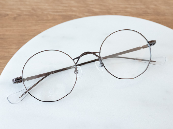 ラウンド(円形)がベースなのですが、下半分がカクカクとした多角形デザインが個性的なメタルフレームです。