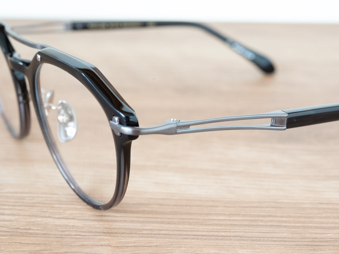 ブリッジの上からT-スパインが見え、前からメガネを見た時に、まるでブリッジが2本あるツーブリッジのフレームのように見えるというユニークなデザインになっております。