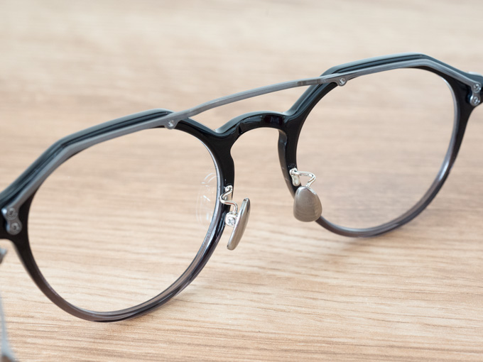 2本とも同じ太さだとブリッジの印象が強くなり、「いかにもツーブリッジのフレーム」という感じになるのですが、ブリッジの存在感を少し薄めることで掛けやすいデザインに仕上がっております。