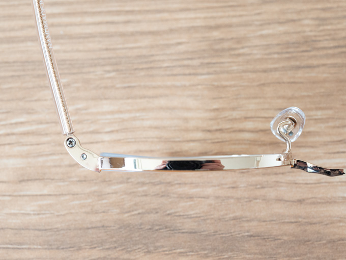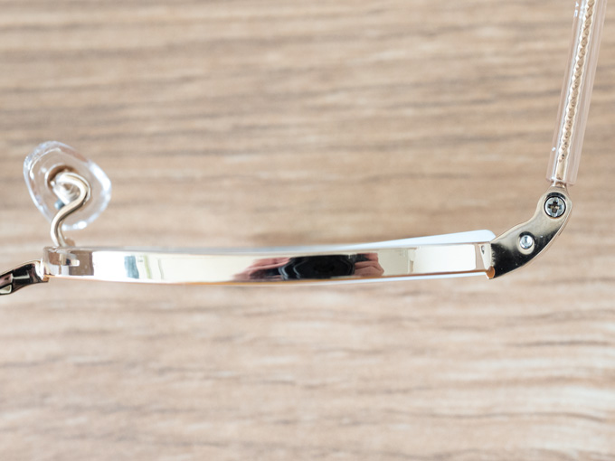正面から見るとレディースフレームらしい線の細いすっきりしたフレームなのですが、太めのリム線を使うことで度数が強くてレンズが厚く仕上がってしまった場合でも、レンズの厚みが目立ちにくくなっています。