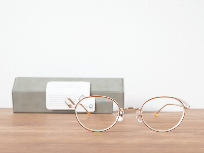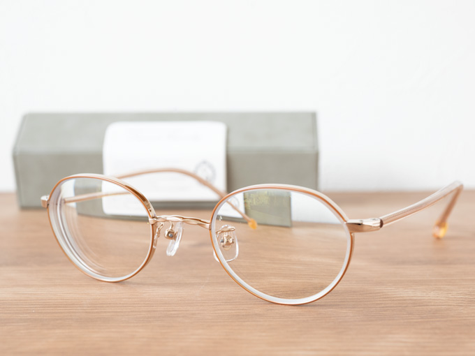 ラスチックのテンプルエンドのぷっくりと丸いデザインや、槌目打ち模様のブリッジがアクセサリーみたいと人気のフレームです。
