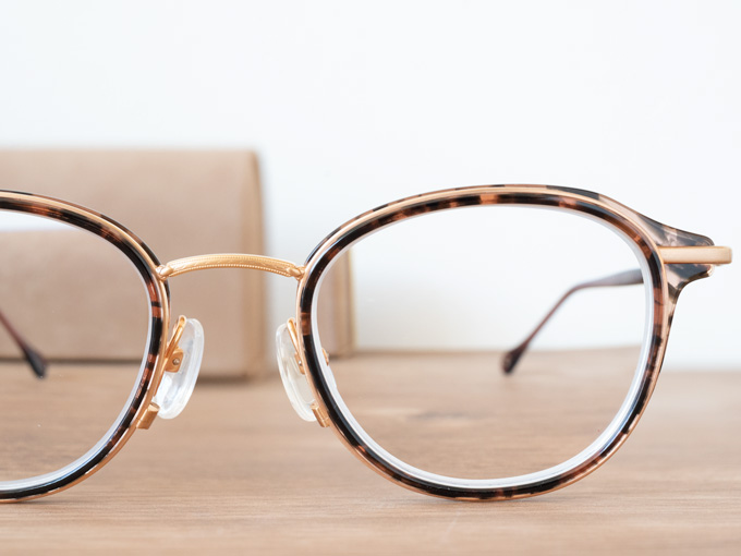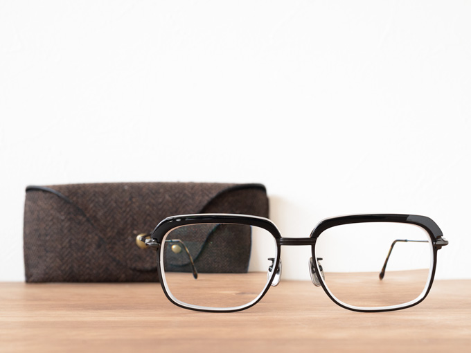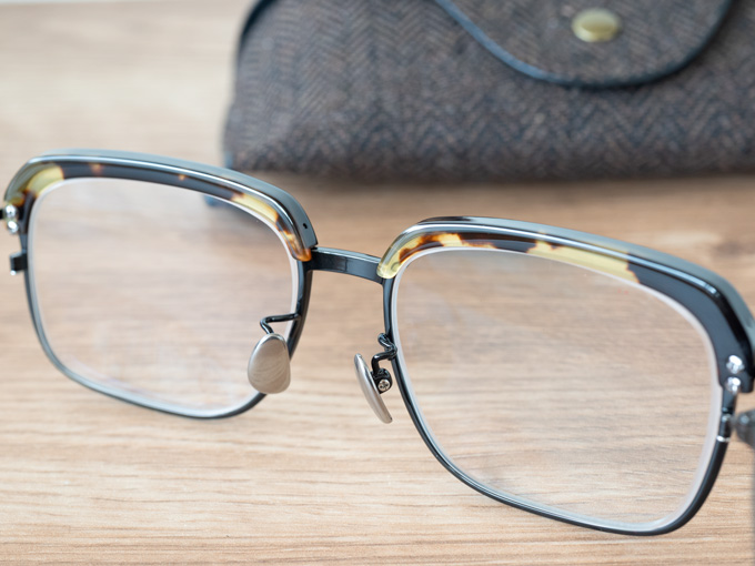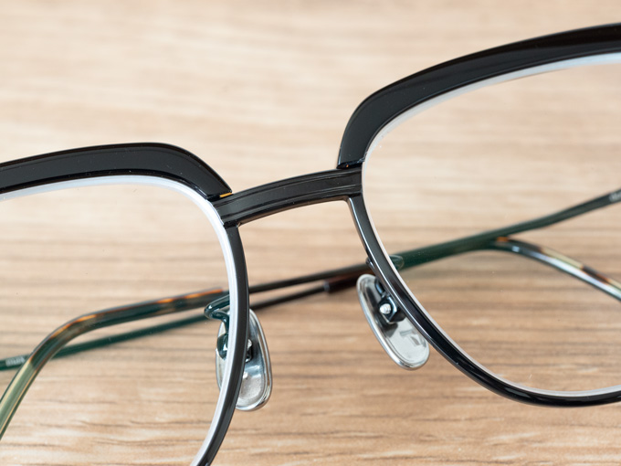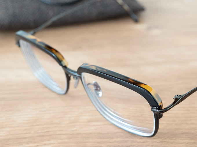 セルロイドに重なったチタンのリムが、見えたり見えなかったりして目を惹くデザインです。
