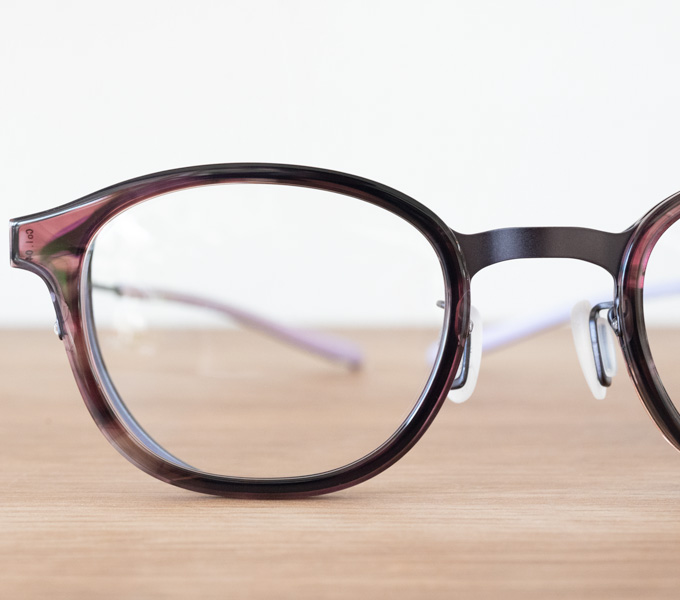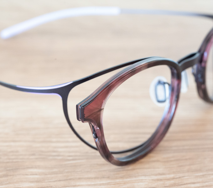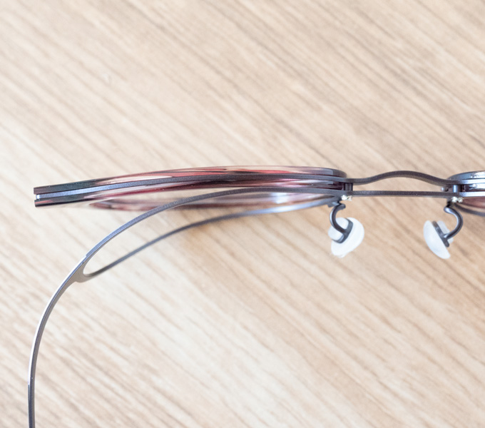 レンズが入る部分は、シート状のチタンにプラスチック(アセテート)のリムをはめ込んだ構造になっております。
