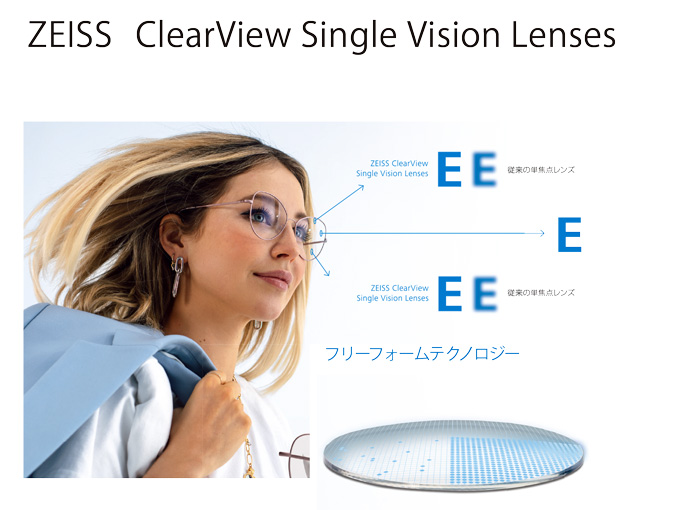 レンズはClearView(クリアビュー)というレンズで、ツァイスの既製品の単焦点レンズす。(レンズの厚みを抑えるため1.67素材を使用)