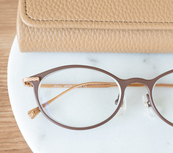 オーバル(楕円形)シェイプのmiu2は、厚めのチタンシートをくり抜いたフロント一体型の柔らかな印象のフレームです。