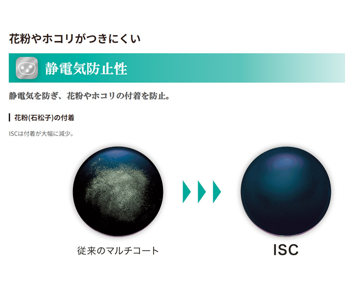 以前ご紹介した東海光学のレンズコーティング、インクレディブルシールドコート(ISC)もその一つで、優れた静電気防止性でレンズ表面に花粉やホコリが付着しにくくなっております。