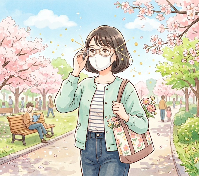 花粉対策が必要になるこれからの季節ですが、目への侵入を防ぐために、度なし・度付き問わずメガネを「バリア」として活用する方が増えています。