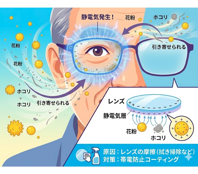 ところで、なぜメガネに花粉やホコリが付くのでしょうか?