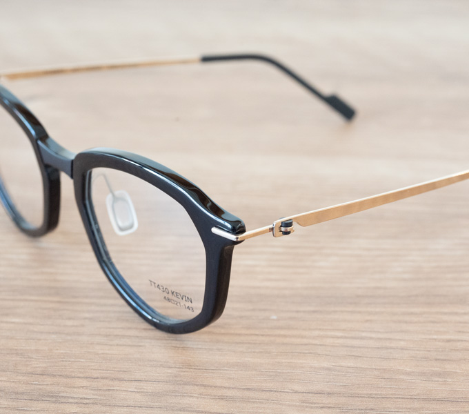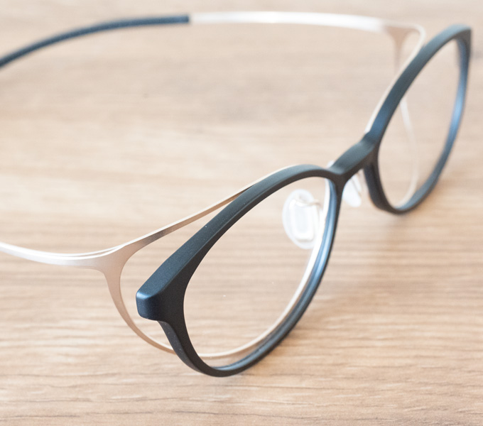 ボリューム感のあるフロントと繊細なテンプルという違いだけでなく、プラスチックとメタル(チタン)という素材による違い、落ち着いたブラックと明るいゴールドというカラーによる違い、そういったいろんな違い(見た目のギャップ)が組み合わさり、独特の存在感を放っています。