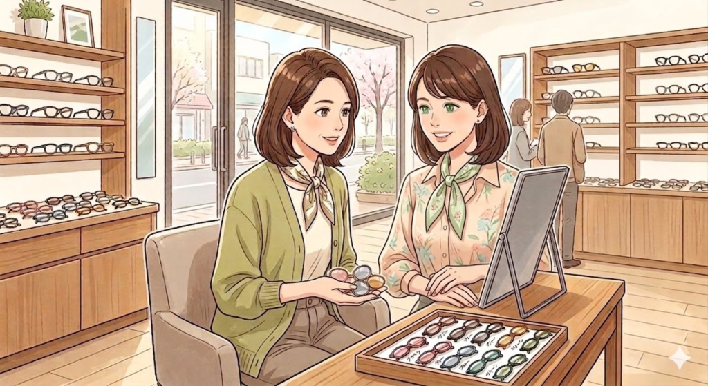 このレンズカラーの特長は、単に眩しさを抑えることではなく、まるで「薄付きのファンデーション」や「コントロールカラー」を塗った時のように、お肌のトーンを整えてくれる効果にあります。