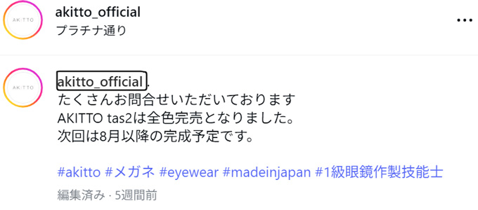 最近、当店でもアキットのお問い合わせすごく増えているのですが、ブランドの方でも人気のモデルは続々と欠品となっているようです。