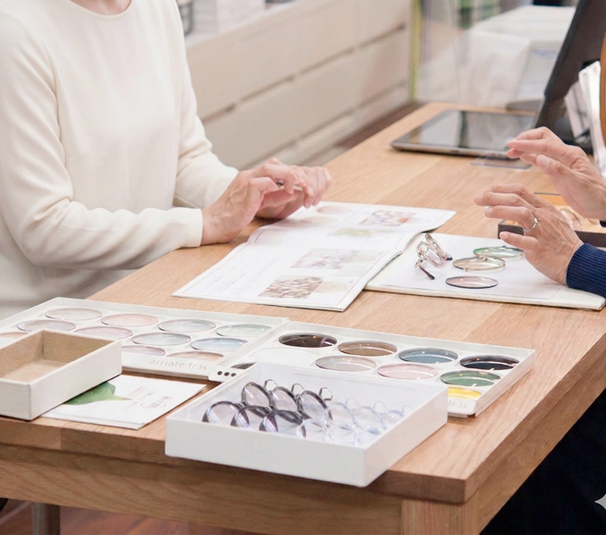 フレームカラーに合わせたカラーレンズのご提案はもちろん、お客様に似合うカラーのご提案もさせていただいております。