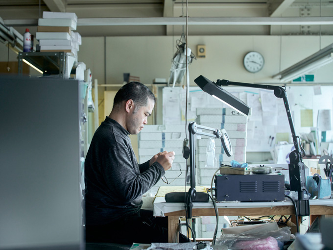 チタニカのフレームを支えているのが、福井県鯖江の眼鏡職人の技術です。パーツのプレス、磨き、染色、組み上げなど、そのほとんどの工程が熟練職人の手仕事によるって行われています。